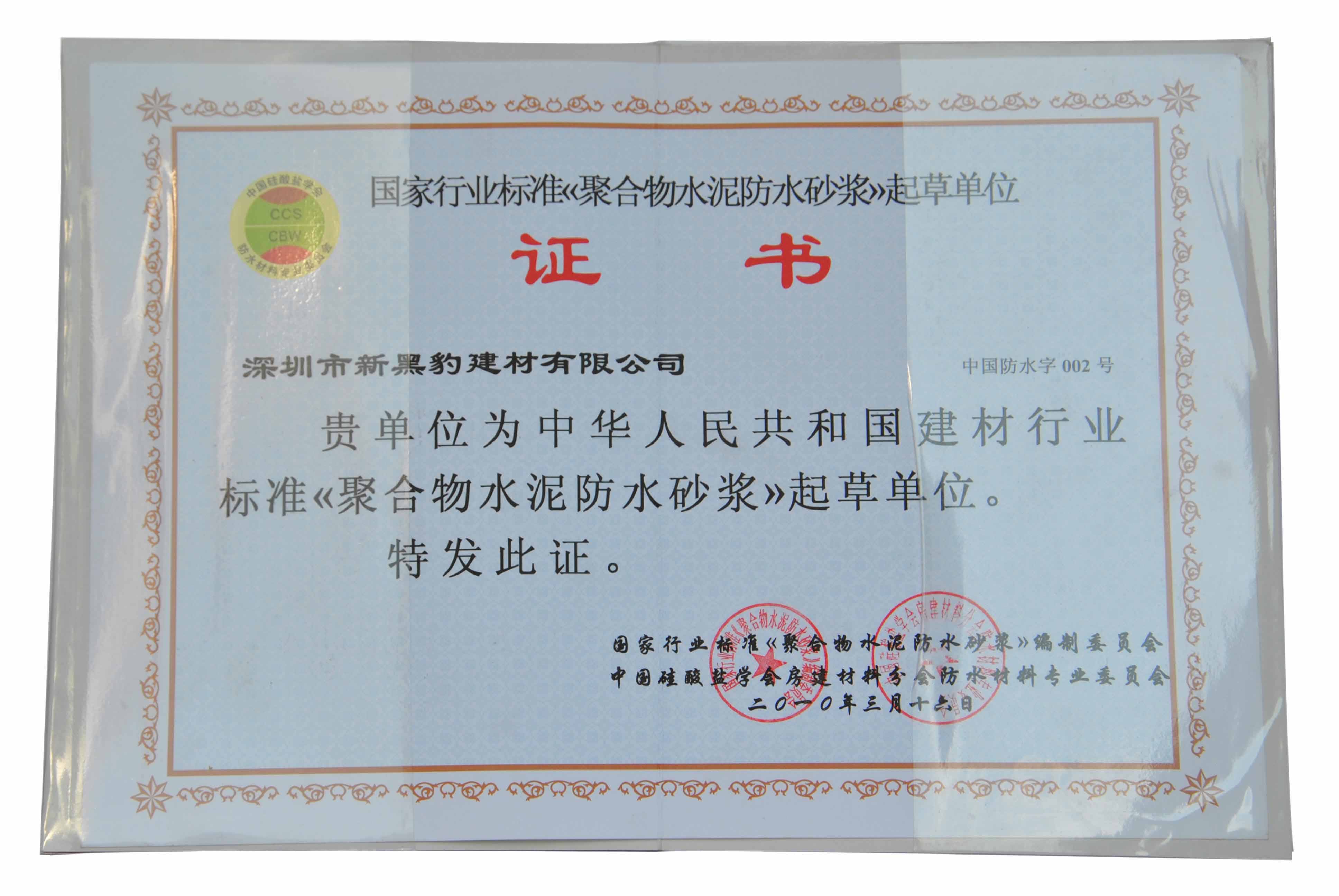 我公司2010年成為中華人民共和國國際標準《聚合物水泥防水砂漿》起草單位證書