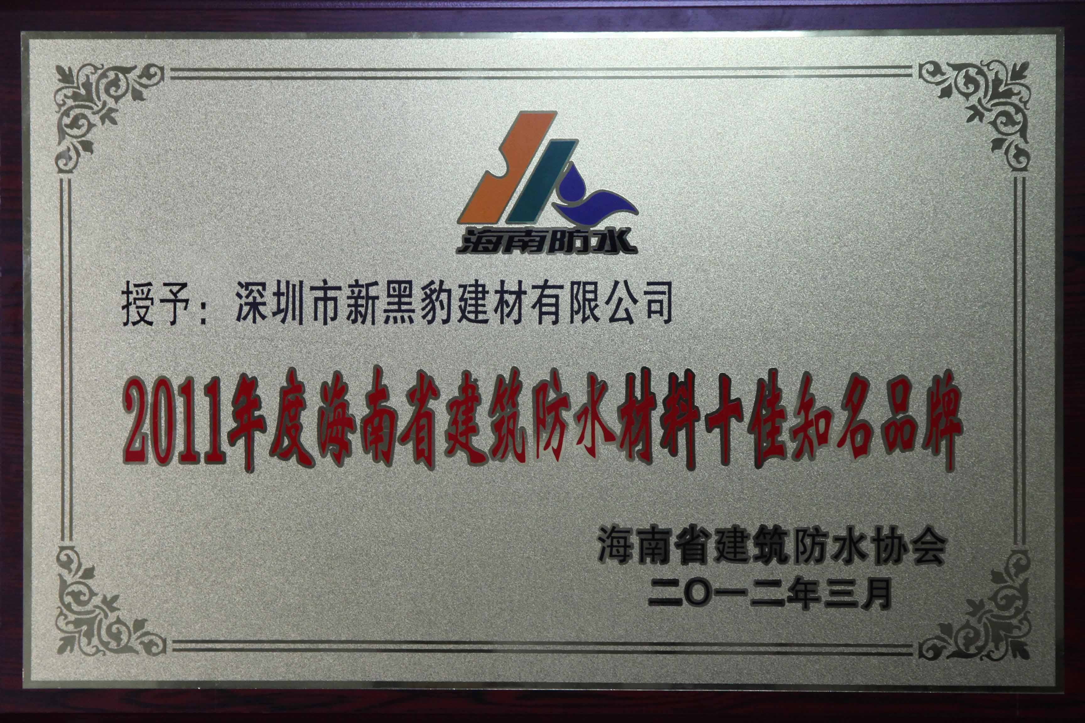 2012年3月,為了表彰海南省建筑防水施工企業(yè)和建筑防水材料生產(chǎn)企業(yè)在誠信規(guī)范經(jīng)營、搞好行業(yè)自律、繁榮防水市場、促進(jìn)行業(yè)發(fā)展等方面做出的突出貢獻(xiàn),海南省建筑防水協(xié)會決定評選出2011年度“海南省建筑防水施工十大知名企業(yè)”和“海南省建筑防水材料十佳知名品牌”,并在海南省建筑防水協(xié)會2011年度表彰大會上頒發(fā)牌匾和證書。我公司獲得“2011年度海南省建筑防水材料十佳知名品牌”。
