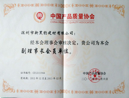 2012年12月,深圳市新黑豹建材有限公司成為中國產品質量協會的副理事長單位,我司將積極努力并充分發揮協會組織、協調、服務職能,為提高我國產品與服務質量的總體水平做出最大貢獻。