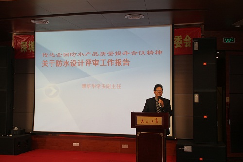 瞿培華常務副主任傳達“全國建筑防水產品質量提升工作會議”精神、作了《關于防水設計評審工作》報告。