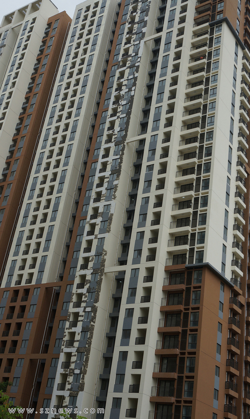 深圳新聞網7月26日訊(記者 王丹丹)安居房項目中海閱景花園存在質量問題?近日,有不少網友在深圳各大論壇反映(點擊進入貼文),深圳安居房中海閱景花園項目外墻嚴重脫落,7月25日記者在現場發現,閱景花園4棟塔樓均存在不同程度的外墻脫落,最嚴重的部分從一樓到頂樓均有脫落現象。