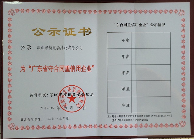 我公司于2014年6月被深圳市市場監督管理局評為廣東省守合同重信用企業。