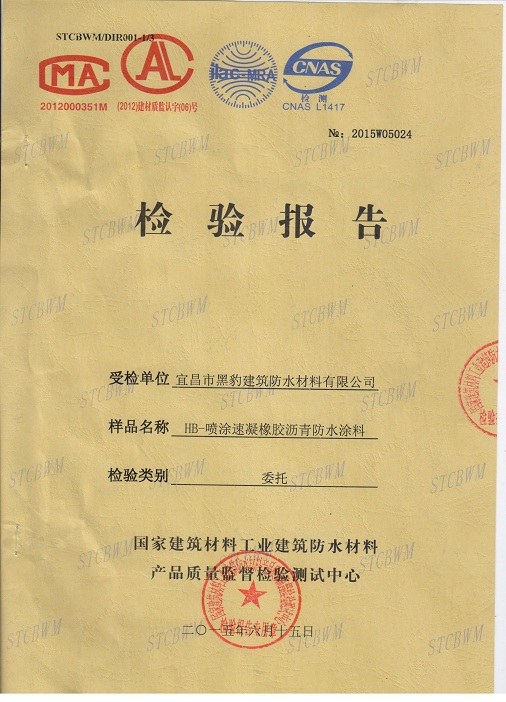 我公司研發的HB噴涂速凝橡膠瀝青防水涂料,現已委托我公司的控股子公司宜昌市黑豹建筑防水材料有限公司生產并委托國家建筑防水材料產品質量監督檢驗測試中心按照我公司企業標準進行了型式檢驗。現檢測結果均符合我公司的企業標準。