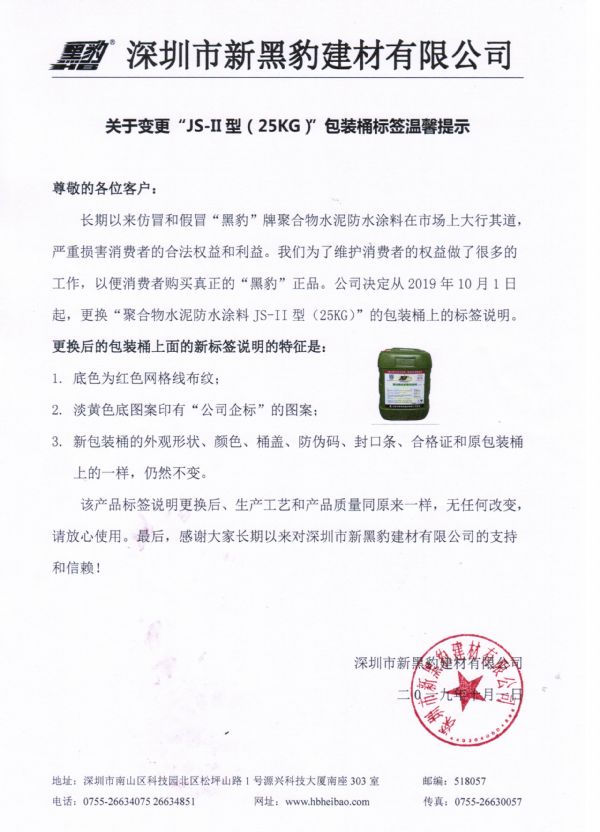 | 尊敬的各位客戶: 長期以來假冒和仿冒“黑豹”牌聚合物水泥防水涂料在市場上大行其道,嚴重損害消費者的合法權益和利益。我們為了維護消費者的權益做了很多的工作,以便消費者購買真正的“黑豹”正品。公司決定從2019年10月1日起,更換“聚合物水泥防水涂料JS-II型(25KG)”的包裝桶上的標簽說明。 更換后的包裝桶上面的新標簽說明的特征是: 1.底色為紅色網格線布紋; 2.淡黃色底圖案印有“公司企標”的圖案; 3.新包裝桶的外觀形狀、顏色、桶蓋、防偽碼、封口條、合格證和原包裝桶上的一樣,仍然不變。 該產品標簽說明更換后、生產工藝和產品質量同原來一樣,無任何改變。請放心使用。最后,感謝大家長期以來對深圳市新黑豹建材有限公司的支持和信賴!