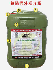 ① 包裝桶為綠色(25公斤裝)方形塑料桶。桶底上部均雕刻有“”商標圖案并寫有深圳市新黑豹建材有限公司制造。